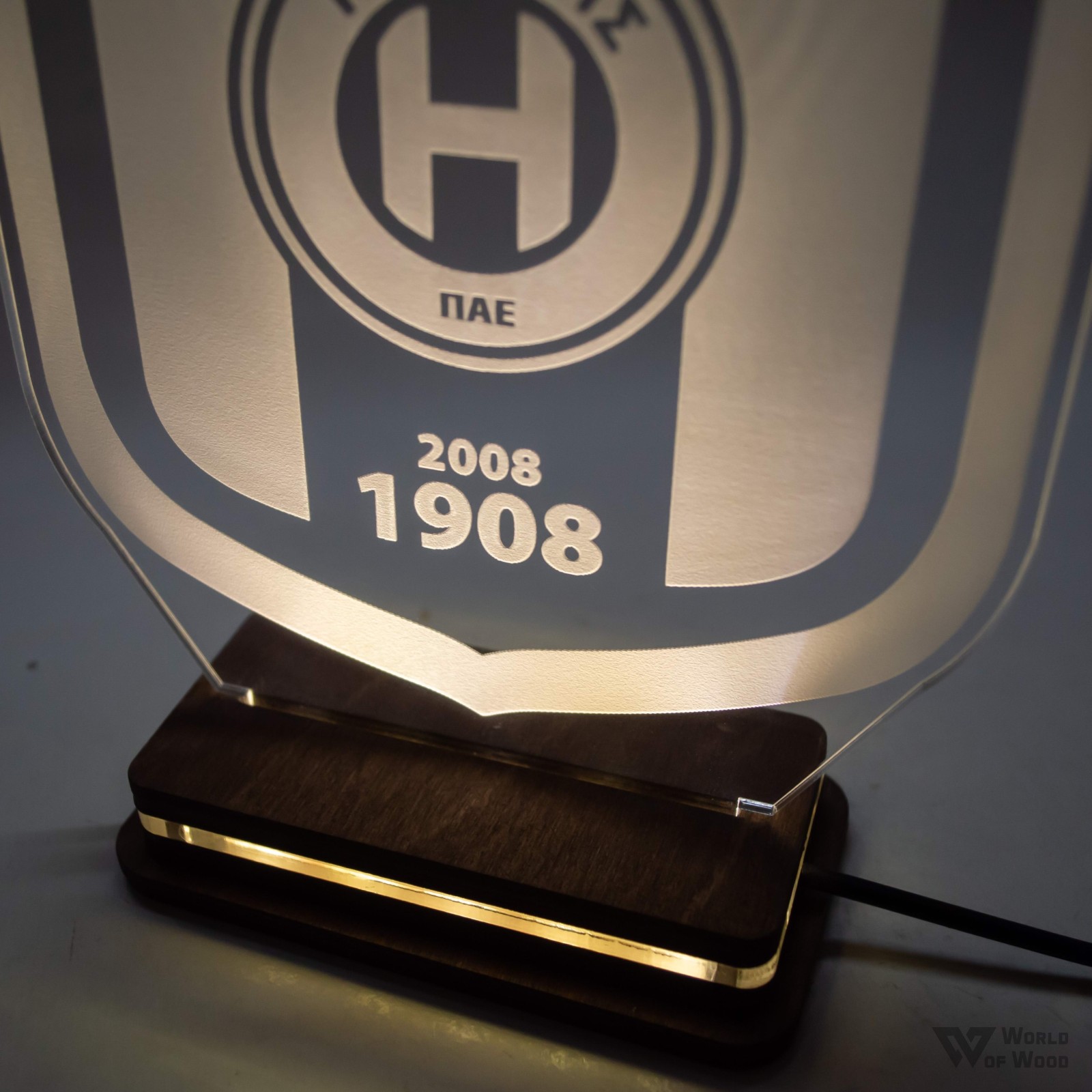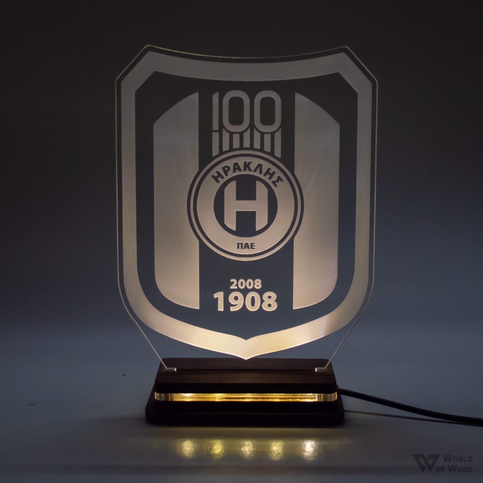 Χειροποίητο Φωτιστικό LED Φωτιστικό LED "Ηρακλής 100 Χρόνια" με Ξύλινη βάση και Plexiglass